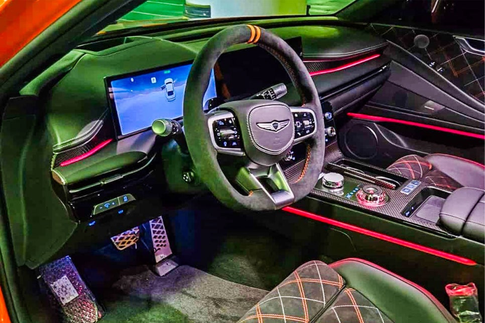 실내 역시 블랙 알칸타라와 오렌지 스티치, 레카로 버킷 시트, 카본 트림을 통해 스포츠 세단의 분위기를 강조했다. 이는 마그마 브랜드가 추구하는 ‘감성적 퍼포먼스’의 방향성을 가장 직관적으로 보여주는 공간이다.