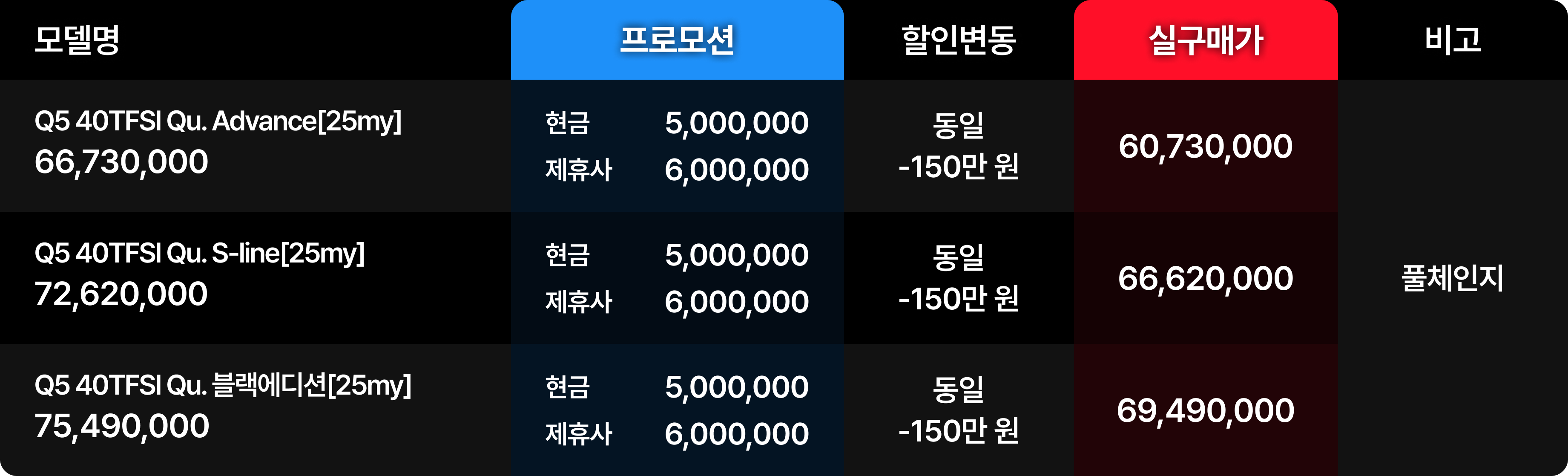 부진한 실적에도 불구하고 #26년1월아우디프로모션 조건은 오히려 후퇴했다. Q5 전 라인업에서 전월 대비 할인액이 150만 원 감소하며 소비자들의 구매 의욕을 꺾고 있다. 에이원오토 관계자의 분석에 따르면 이는 재고 물량 부족 혹은 차세대 모델 출시를 앞둔 재고 관리 전략의 일환일 가능성이 크다. 지금 시점에서 Q5 구매는 경제적 관점에서 매력이 떨어진다.
