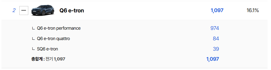 신규 라인업인 #아우디 Q6 e트론 성적은 고무적이다. 2025년 한 해 1,097대의 판매고를 올리며 아우디의 새로운 캐시카우로 부상했다. 프리미엄 플랫폼 일렉트릭(PPE)이 적용된 첫 모델로서 기술적 우위를 점한 것이 주효했다. 이번 달 프로모션 역시 1,000만 원 이상의 높은 수준을 유지하며 판매 가속도를 붙이고 있다.