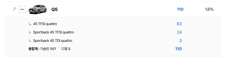 이와 대조적으로 #아우디 Q5 지표는 매우 암울하다. 2025년 한 해 동안 국내 시장에서 단 110대 판매라는 처참한 성적표를 받아 들었다. 이는 아우디라는 브랜드 네임벨류를 고려했을 때 믿기 힘든 수치다. 모델 노후화와 더불어 경쟁 모델들의 잇따른 풀체인지가 판매 부진의 직격탄이 된 것으로 보인다.