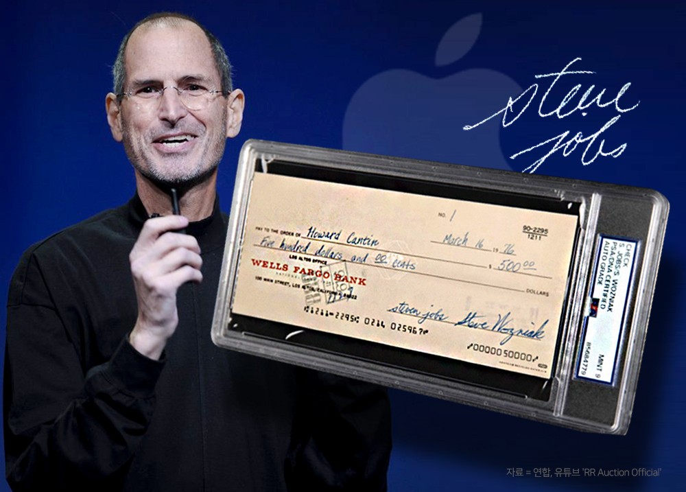 미국 은행 웰스파고에서 1976년 3월 16일 발행한 것으로 기록된 이 수표는 애플 공동창업자 스티브 워즈니악이 개발한 개인용 컴퓨터(PC) '애플-1' 회로도를 실제 인쇄회로기판(PCB)으로 구현한 설계자 하워드 캔틴 앞으로 발행됐으며 잡스와 워즈니악의 서명이 함께 들어가 있다.