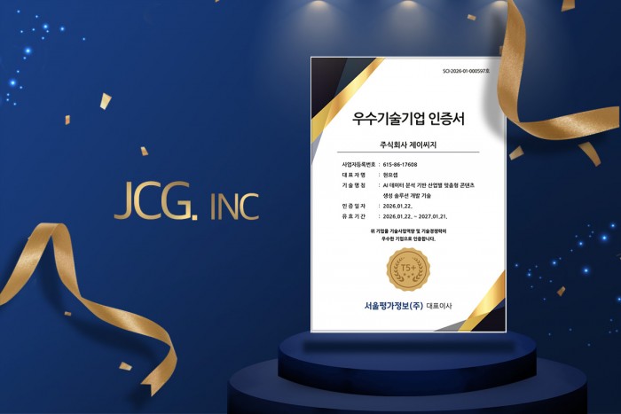 국내 공공기관 AI 솔루션 시장의 선도기업 제이씨지가 기술평가(TCB) 우수 등급을 획득하며 기술력과 시장성을 공식적으로 인정받았다.