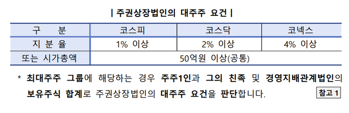 최대주주 그룹에 해당하는 경우에는 주주 1인과 그 친족, 사실상 경영 지배 관계에 있는 법인의 보유 주식을 합산해 대주주 요건을 판단한다. 지분율 합계가 50퍼센트 이상이 아니더라도 주주 1인 그룹 가운데 가장 높은 지분율을 보유하면 최대주주 그룹으로 본다.