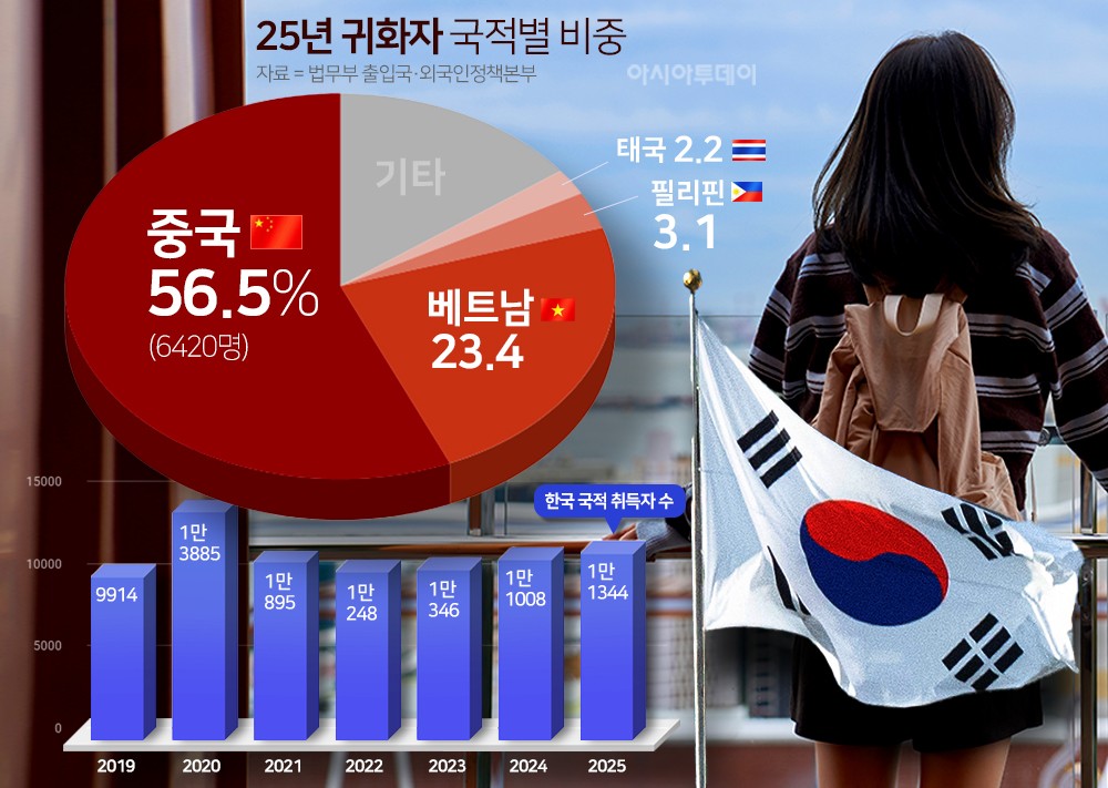 지난해 귀화자 국적별 비중을 보면 중국 국적자가 56.5%(6420명)로 가장 많았다. 중국인 귀화자 수 역시 팬데믹 이후 최대 수준이다. 이어 베트남이 23.4%로 뒤를 이었고, 필리핀(3.1%), 태국(2.2%) 순으로 나타났다.