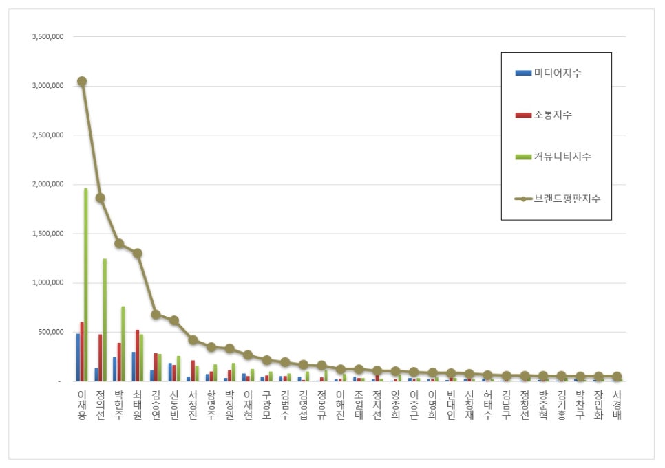 CEO 브랜드평판 1위를 기록한 삼성 이재용 브랜드는 미디어지수 485,541 소통지수 603,381 커뮤니티지수 1,958,862가 되면서 브랜드평판지수 3,047,784로 분석됐다. 지난 1월 브랜드평판지수 3,526,181과 비교하면 13.57% 하락했다.