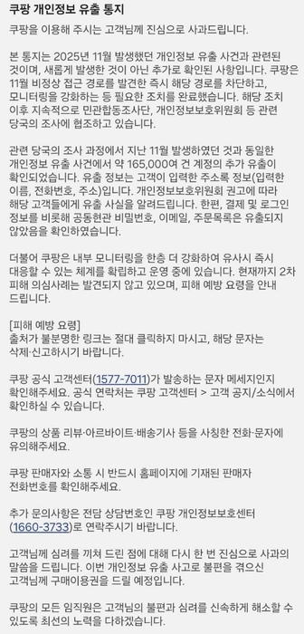 쿠팡은 이번 추가 유출 고객에게도 1인당 5만원 상당 구매이용권을 보상으로 지급할 예정이다. 또한 출처가 불분명한 링크를 클릭하지 말고, 상품 리뷰·아르바이트·배송기사를 사칭한 전화와 문자에 유의해 달라고 안내했다.