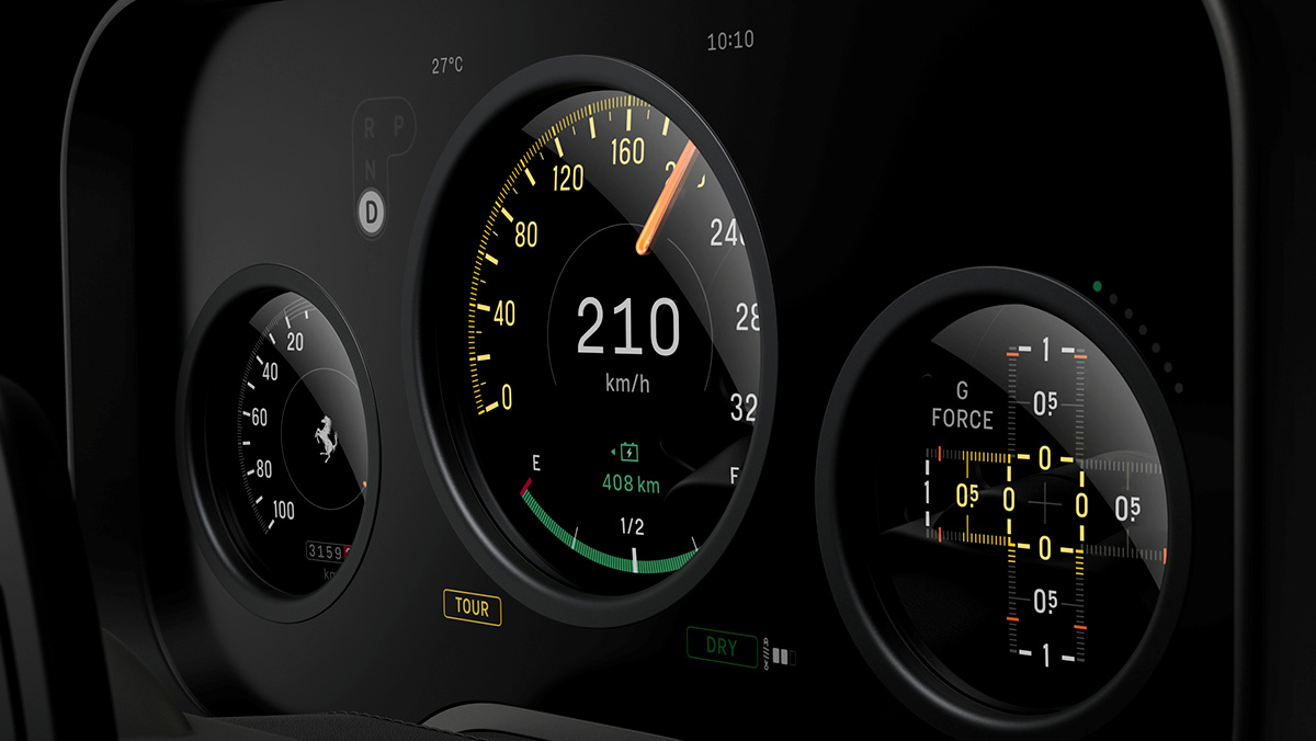 실내 디자인은 ‘휴먼 인터페이스’를 핵심 가치로 내세웠다 . 페라리와 러브프롬은 ‘전기차는 대형 터치스크린이 주도한다’는 업계의 고정관념을 깨고, 다수의 제어 장치를 기계식 버튼과 다이얼로 구현해 사용자가 직접 조작하는 직관적인 경험을 강조했다 .
