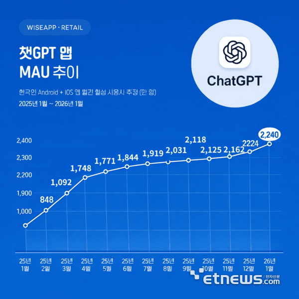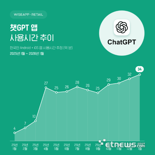 와이즈앱·리테일이 발표한 2026년 1월 데이터에 따르면, 국내 챗GPT 앱의 총 사용 시간은 34억분으로 집계되며 역대 최대치를 경신했다.
