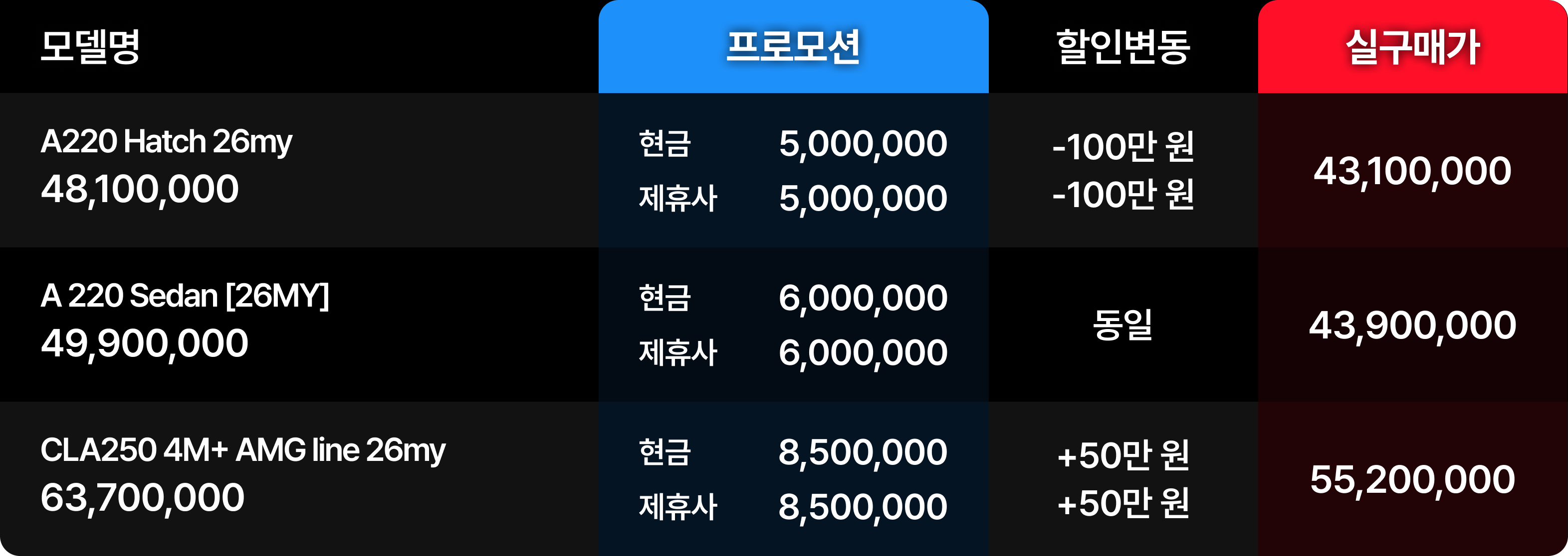 결론적으로 2026년 2월은 모델별 명암이 뚜렷하다. 할인이 유일하게 상승한 벤츠 CLA250 모델은 현재 시점에서 가장 합리적인 선택지가 될 것이다. 반면 벤츠 A220 세단은 보수적인 관점에서의 접근을 추천한다.