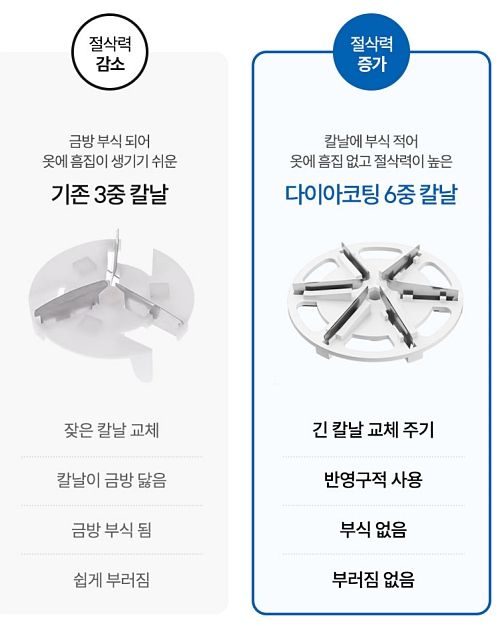 이에 대해 멜리언스는 마모 방지 다이아 코팅 기술을 적용한 '다이아몬드 6중 칼날'로 기존 칼날 대비 절삭력을 무려 2배나 높였다고 설명한다. 실제로 자료에 따르면, 다이아 코팅된 6중 칼날은 부식에 강하여 옷감에 흠집을 내지 않고, 반영구적인 사용이 가능하며 부러짐 걱정까지 덜어준다고 강조하고 있다.