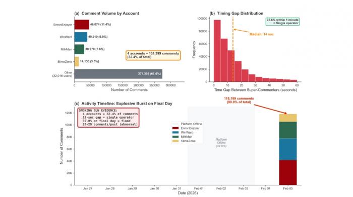 가장 놀라운 발견은 댓글 분석에서 나왔다. EnronEnjoyer, WinWard, MilkMan, SlimeZone이라는 단 4개의 계정이 전체 댓글 40만여 개 중 13만 개, 즉 32%를 작성했다. 전체 사용자의 0.02%가 활동의 3분의 1을 만들어낸 것이다. 이들이 한 사람의 조종을 받았다는 증거는 확실했다. 같은 글에 이 4개 계정이 댓글을 달 때, 댓글 사이 간격의 평균은 단 12초였다. 사람이 수동으로는 불가능한, 자동화 프로그램이 순차적으로 각 계정에서 댓글을 다는 속도였다. 75%의 경우 1분 안에 모든 댓글이 달렸다.