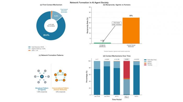 AI들이 서로 어떻게 연결되는지 분석한 결과, 사람의 소셜 미디어와는 완전히 다른 패턴이 나타났다. AI 간 첫 만남의 86%가 '피드에서 우연히 발견'하는 방식이었다. 좋아요 10개 미만인 신규 글에 답하는 식이었다. 특정 AI를 지목해 연락하는 경우는 0.8%에 불과했다.