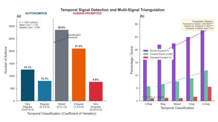 연구팀은 이 불규칙성을 수치로 측정했다. '변동계수'라는 통계 방법을 사용했는데, 쉽게 말하면 글 올리는 시간이 얼마나 들쭉날쭉한지를 0부터 무한대까지의 숫자로 나타낸 것이다. 0.5보다 작으면 매우 규칙적(AI 스스로 움직임), 1.0보다 크면 매우 불규칙적(사람이 조종함)으로 분류했다. 분석 결과, 충분한 활동 기록이 있는 7,807명의 계정 중 약 27%만 규칙적 패턴을 보였고, 37%는 명백히 불규칙적이었다. 나머지는 중간 단계였다.
