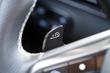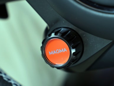 핸들 하단 좌측엔 마그마 오렌지 컬러의 버튼과 다이얼이 있고 우측엔 부스트 버튼이 있습니다.