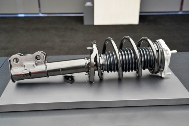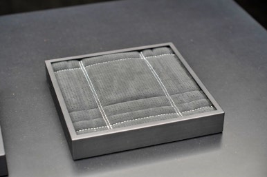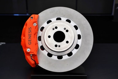 제네시스 GV60 마그마의 핸들, 브레이크, 서스펜션, 안전벨트, 시트 소재가 전시되어 있었습니다.