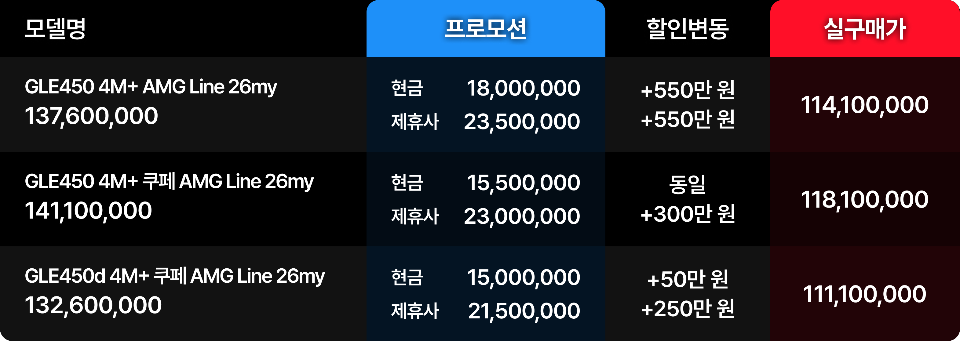 특히 GLE450 AMG Line 모델은 전월 대비 550만 원의 추가 할인을 기록하며 2,350만 원이라는 기록적인 수치를 달성했습니다.