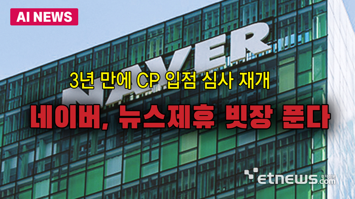 네이버가 3년 만에 콘텐츠제휴(CP)사 입점 심사를 재개한다. 기존 제휴 평가 기준이 크게 달라지지 않지겠만 전문가 위원 평가가 강화될 전망이다. 네이버 뉴스의 영향력이 커진 만큼 까다로운 입점 심사가 예측된다. ▶ 동영상 콘텐츠는 더존비즈온 '원스튜디오'를 활용해 제작되었습니다. 정승준 기자 ajune@etnews.comK-뷰티, 해외 진출 가파른데 특허 출원은 저조 “비용 부담 막강”인천 송도 바이오의약품 연간 생산능력, 올해 116만L 눈앞엔비디아, 메타에 AI칩 수백만개 공급…그레이스 CPU도 단독 채택마이크론, 내년 중반 신규 팹 가동…“현재 수요 절반만 공급 중”삼성·LG 지난해 OLED TV 시장서 각각 최대 성장·판매율 기록