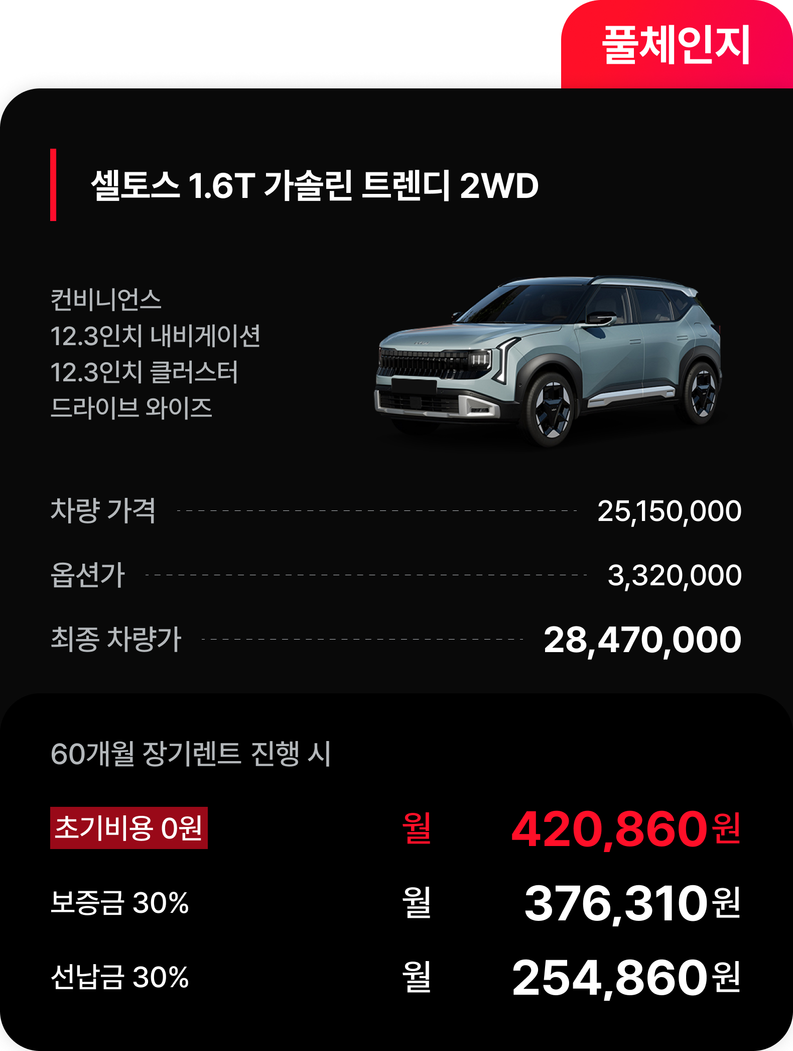 본지는 에이원오토의 실시간 금융 데이터를 바탕으로 두 모델의 실질적인 유지비용을 전격 분석했다. 먼저 2세대 셀토스 가솔린 1.6 터보 트렌디 모델의 견적을 살펴보자. iM 캐피탈 기준 최종 차량가는 2,847만 원이며 60개월 무보증 조건에서 월 렌트료는 420,860원으로 책정되었다.