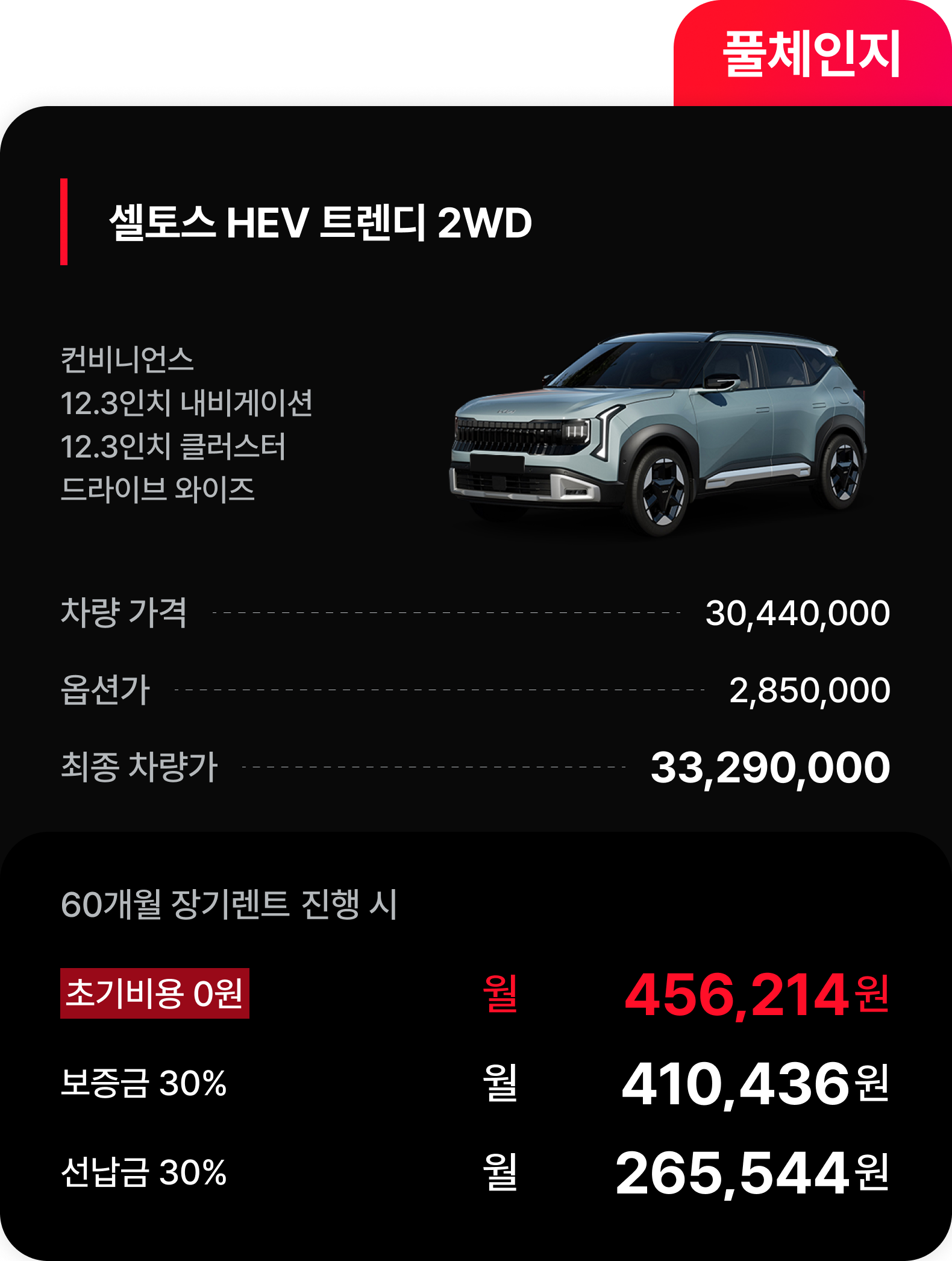 반면 신형 셀토스 하이브리드 트렌디 모델은 반전의 숫자를 제시한다. 최종 차량가는 3,329만 원으로 가솔린 대비 약 482만 원 높게 책정되어 있다. 하지만 우리금융캐피탈의 장기렌트 견적 결과 월 납입금은 456,214원으로 산출되었다. 두 모델 간의 임대료 차이는 월 35,354원이다.