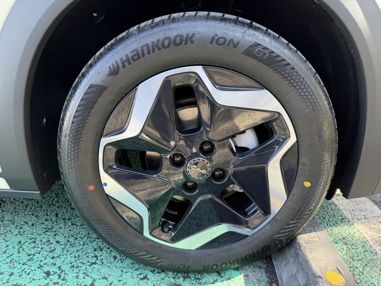 타이어는 전기차 전용 고성능 타이어인 '한국타이어 iON(아이온) GT'가 장착되어 있습니다. 규격은 195/60R16이며, 부드러운 승차감과 전비 효율을 극대화하기 위한 최적의 세팅입니다.