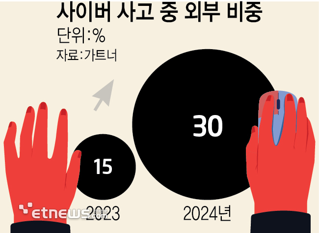 시장조사업체 가트너는 최근 발간한 보고서를 통해 지난 2024년 사이버 사고 중 외부 협력사와 연관된 비중이 약 30%로 전년 대비 15% 포인트(P) 증가했다고 밝혔다.