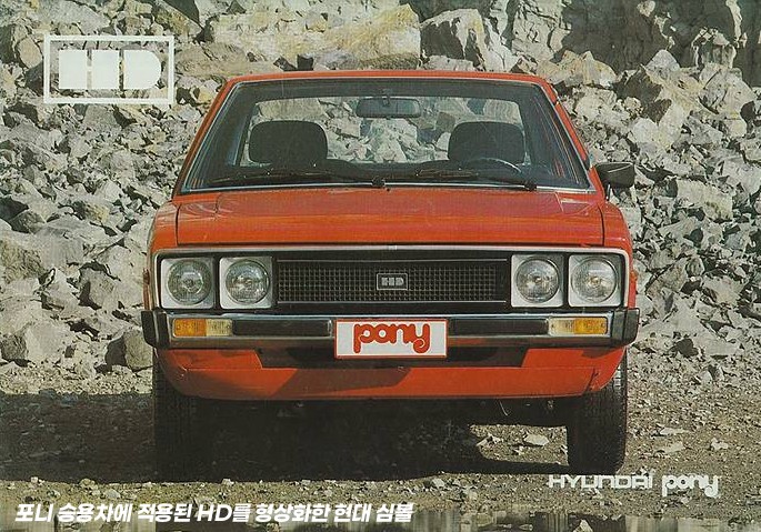 그리고 1975년도에 포니 시판과 함께 사각형을 기조로 한 모던한 HD형태를 쓰기 시작하는데, 저 심벌은 추측하건 대 포니의 디자이너 조르제토 쥬지아로(Giorgetto Giugiaro, 1938~)의 작업으로 보입니다. 쥬지아로는 자신의 회사 ‘이탈디자인(Ital Design)’의 심벌도 영문 I와 D의 머리 글자를 이용해 현대자동차의 HD와 비슷하게 디자인하기도 했습니다. 그런데 이때에 현대자동차의 심벌 변화가 일시에 이루어진 것은 아닌 것 같기도 합니다. 포니 승용차의 국내용 카탈로그에는 바뀌지 않은 심벌도 보입니다.