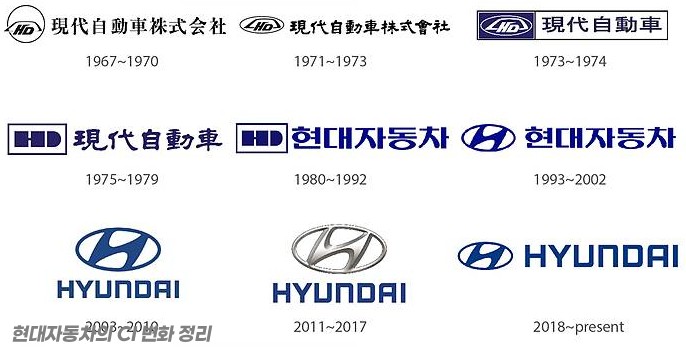 1967년 창립 당시 심벌은 영문 HD 글자 위에 마치 승용차 지붕 같은 모양을 씌우고 원을 둘렀습니다. 그리고 한자의 ‘회’자는 일본식 한자로 보입니다. 한국과 일본, 중국은 모두 한자의 획수를 줄인 속자(俗字) 또는 간체(簡體)를 쓰기도 하지만, 조금씩 다릅니다. 그런데 1971년도에는 ‘회(會)’자가 우리나라에서 쓰는 모든 획수를 쓰는 정자(正字), 이른바 번체(煩體)로 바뀝니다. 그리고 심벌의 원도 타원으로 바뀝니다. 이건 아마 기술제휴 기업 포드의 심벌과 같은 타원으로 보입니다.