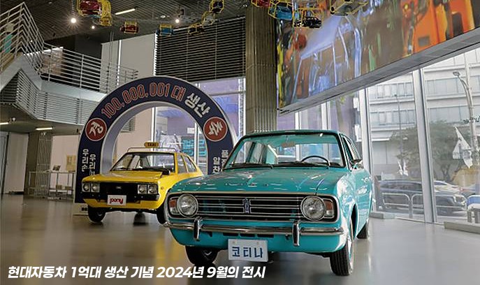 현대자동차는 재작년이었던 2024년도에는 그해 9월 30일 기준으로 누적 생산 1억대를 달성했다는 소식도 있었습니다. 현대 모터스튜디오에서는 현대자동차가 처음 생산한 승용차였던 포드 코티나(Cortina Mk II)와 1975년에 시판한 첫 고유모델 포니 승용차를 함께 전시하기도 했습니다.