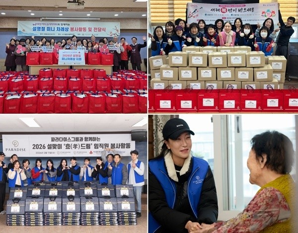 부산 해운대구 운봉종합사회복지관에서는 11일 파라다이스그룹 임직원들과 함께 ‘효(孝)드림’ 봉사활동을 진행했다. 임직원들은 반송영구임대아파트 인근 어르신 200명을 찾아 명절 선물세트를 전달하고 안부를 확인했다.