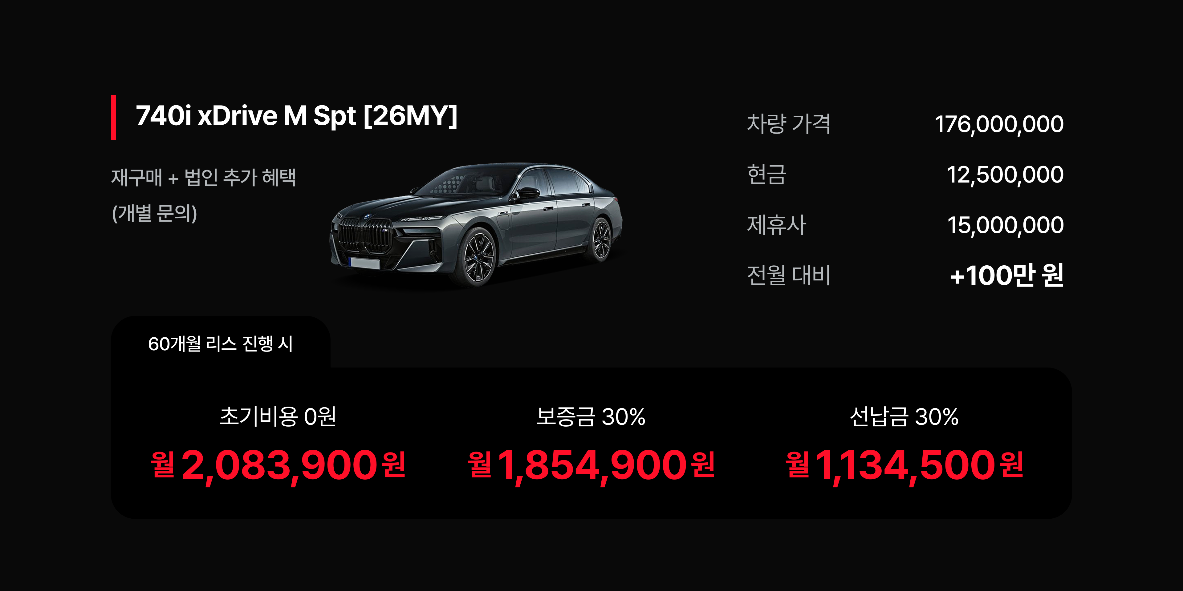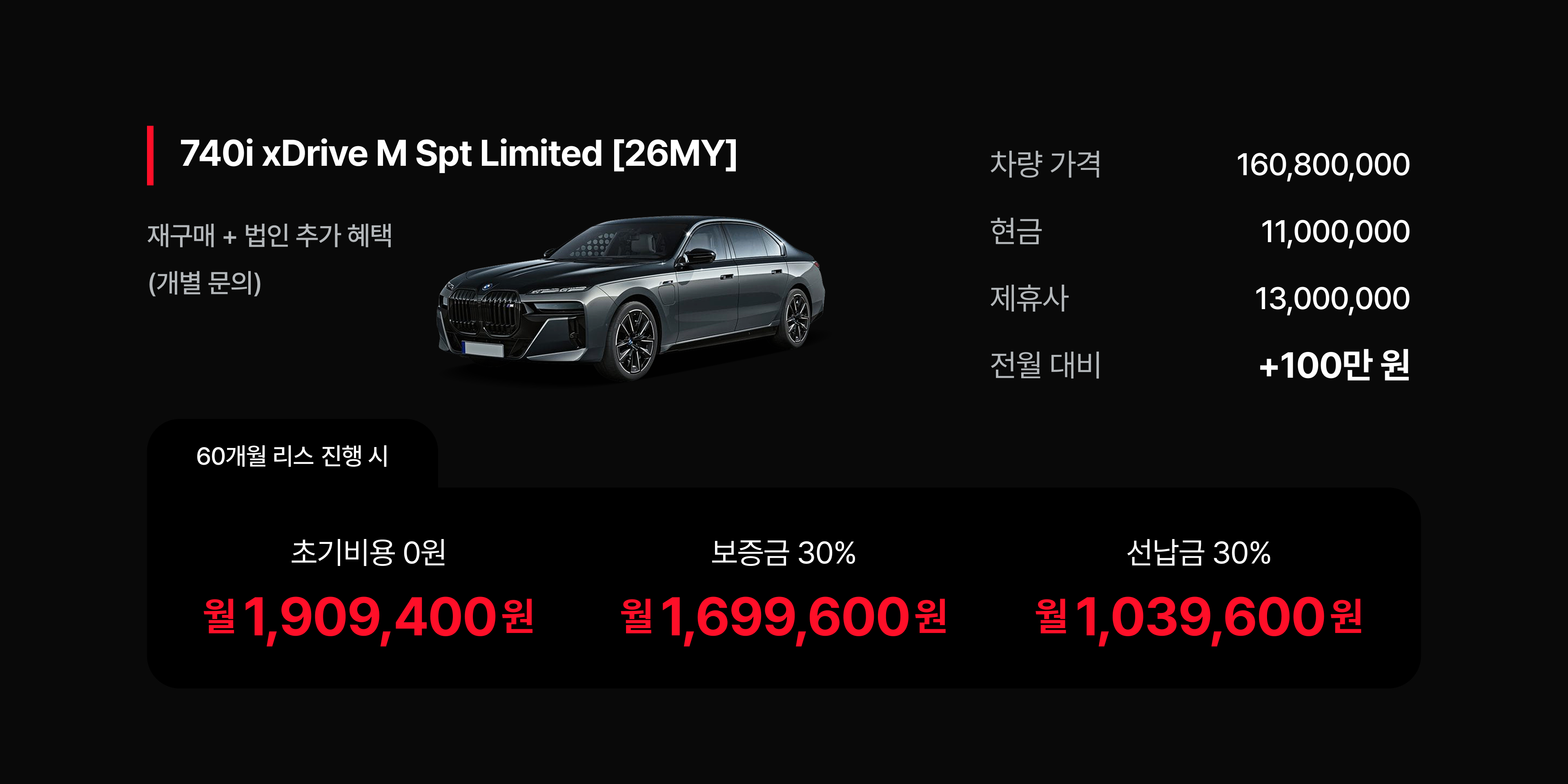이에 맞서는 BMW 7시리즈의 전략은 '최신형의 대중화'입니다. 26년형 740i xDrive M Spt 모델은 전월 대비 100만 원 추가된 1,500만 원의 할인을 제공하며 2억 원에 육박하는 차량을 1억 6,100만 원에 공급하고 있습니다.