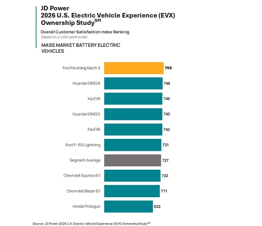 이번 설문조사는 2025~2026년형 전기차 소유자 5741명을 대상으로 실시됐다. JD파워는 작년 8월부터 5개월 동안 △주행 거리 정확도 △공공 충전소 이용의 편의성 △주행 즐거운 서비스 경험 △차량 품질 등 10개 항목을 평가했다.