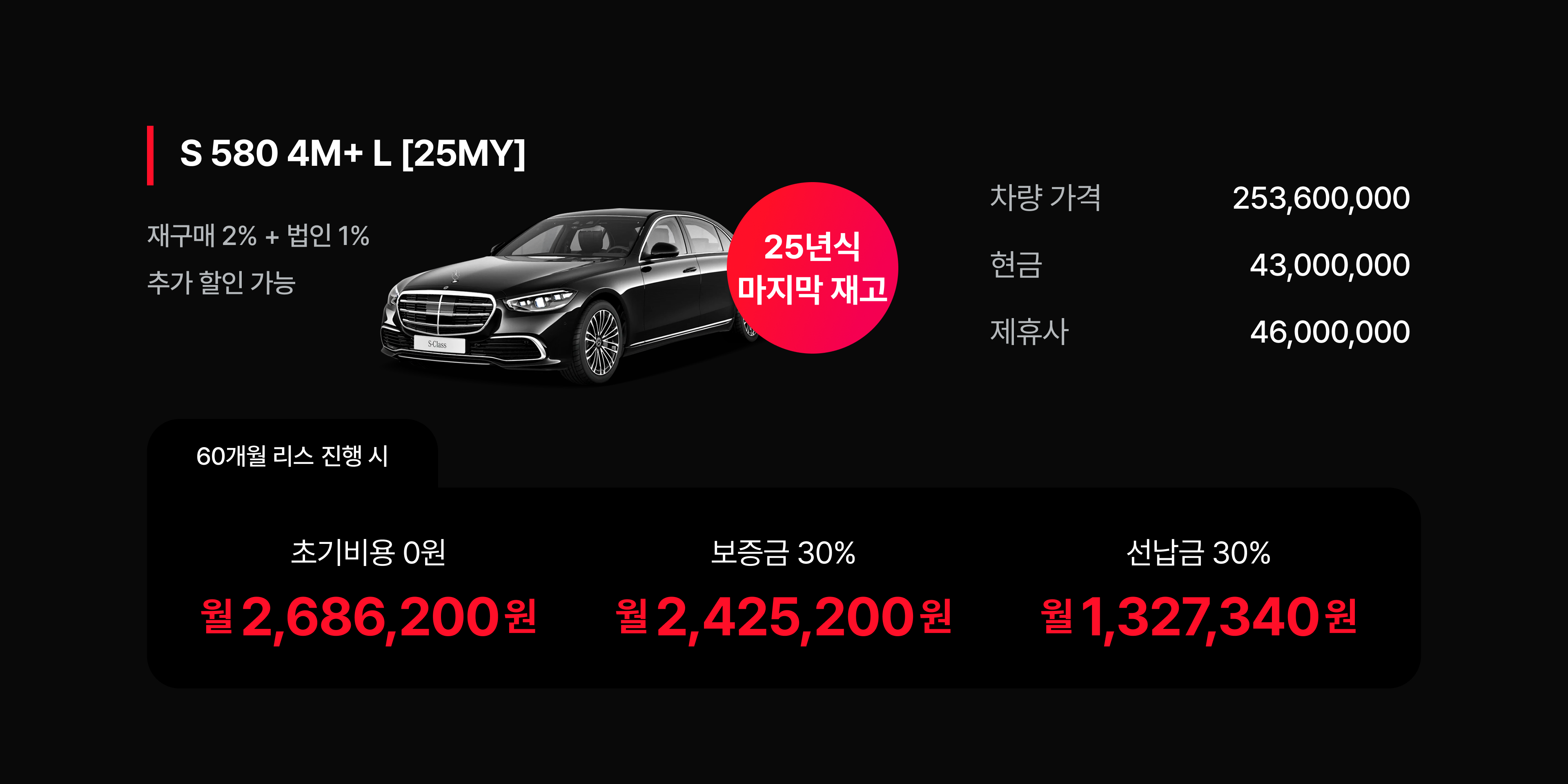 이는 신규 연식 모델 도입 전 재고를 빠르게 소진하려는 브랜드의 의지가 반영된 수치이다. 차량 가격 253,600,000원 대비 높은 할인율은 법인 리스 수요를 강하게 자극할 것으로 예상된다.