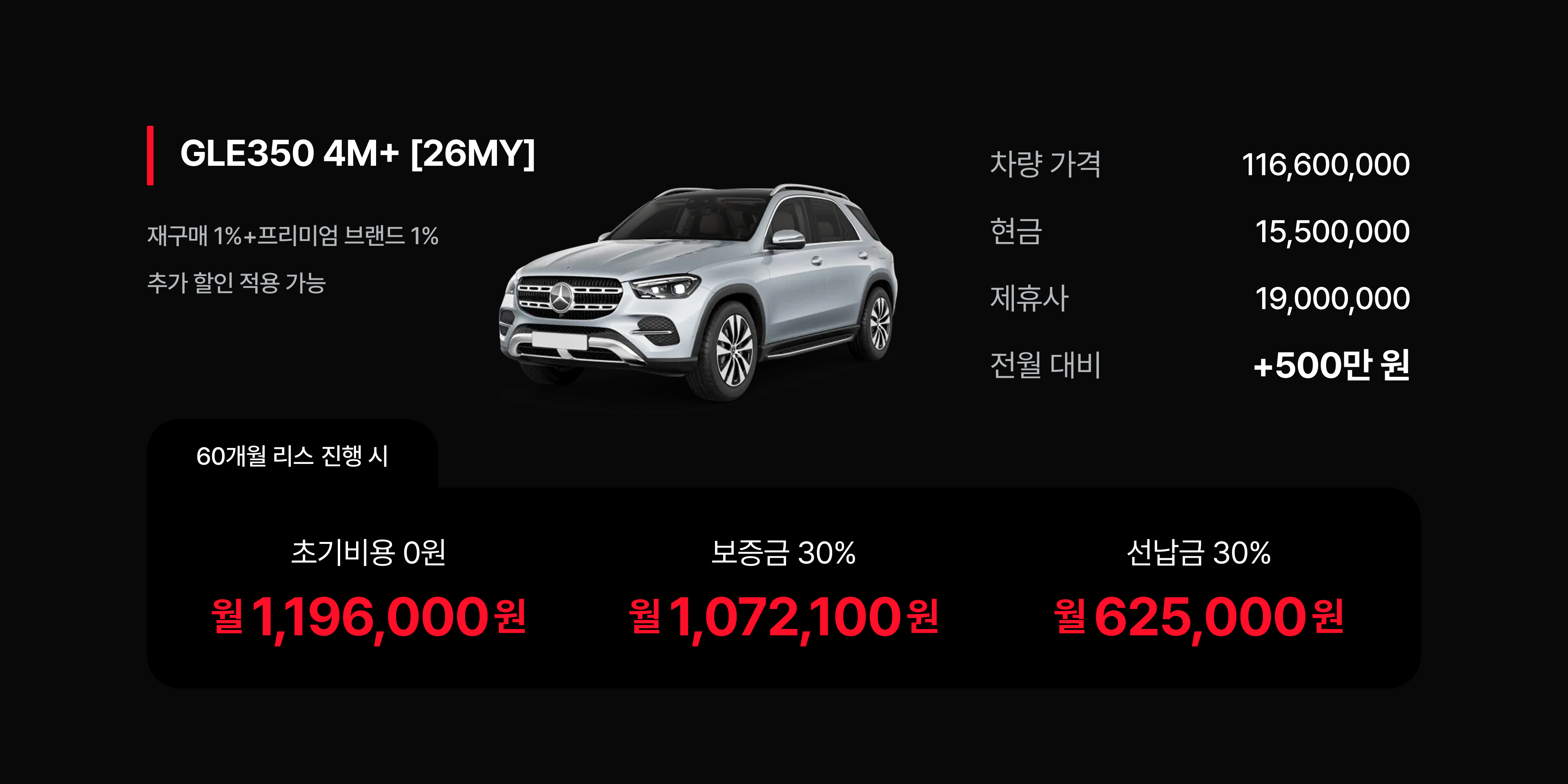 이번 달 가장 드라마틱한 변화를 보인 모델은 벤츠 GLE 350이다. 전월 대비 할인액이 5,000,000원 폭등하며 총 19,000,000원의 할인이 책정되었다. 이는 동급 경쟁 모델과의 경쟁 우위를 탈환하려는 선택이다.