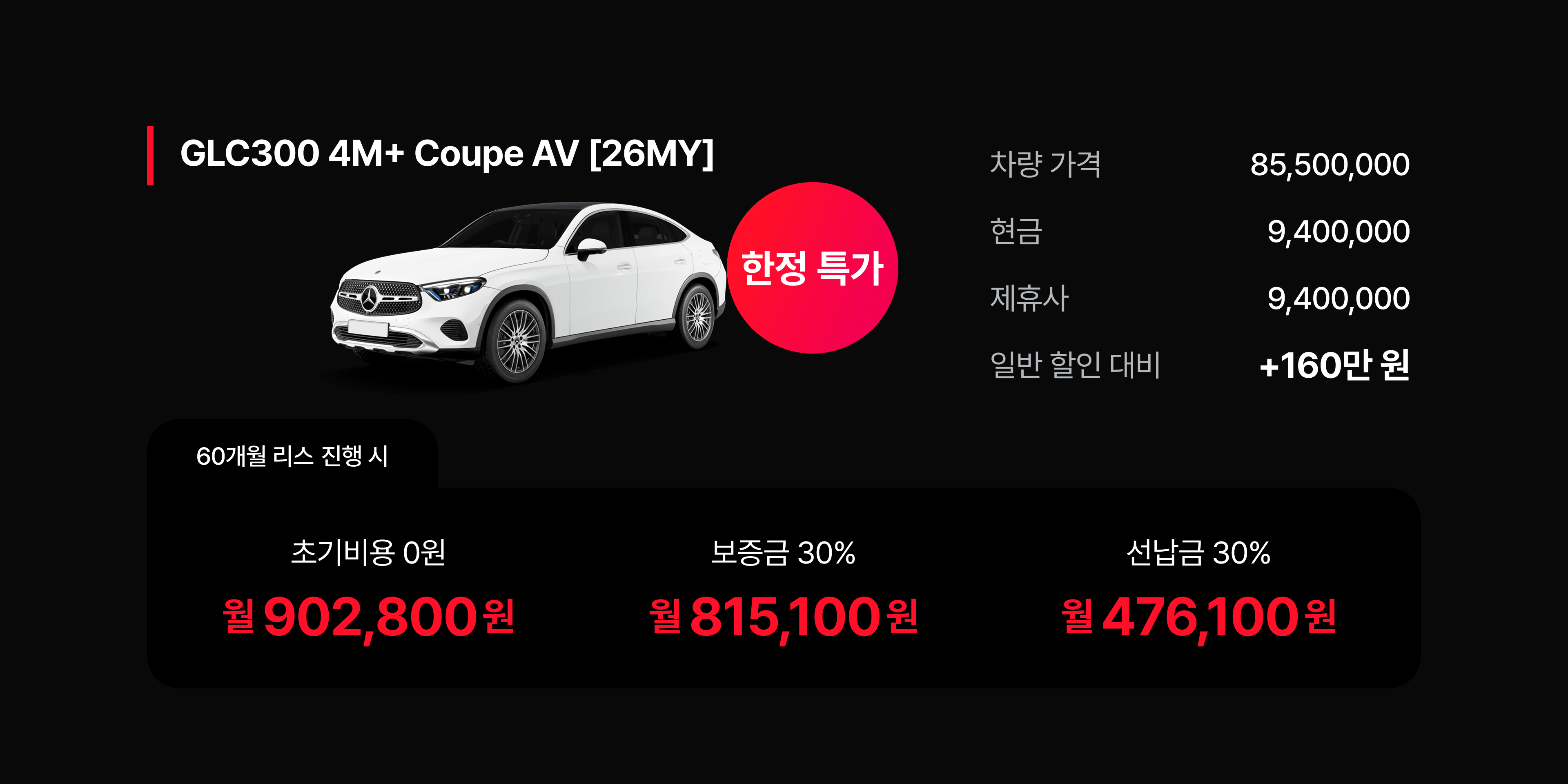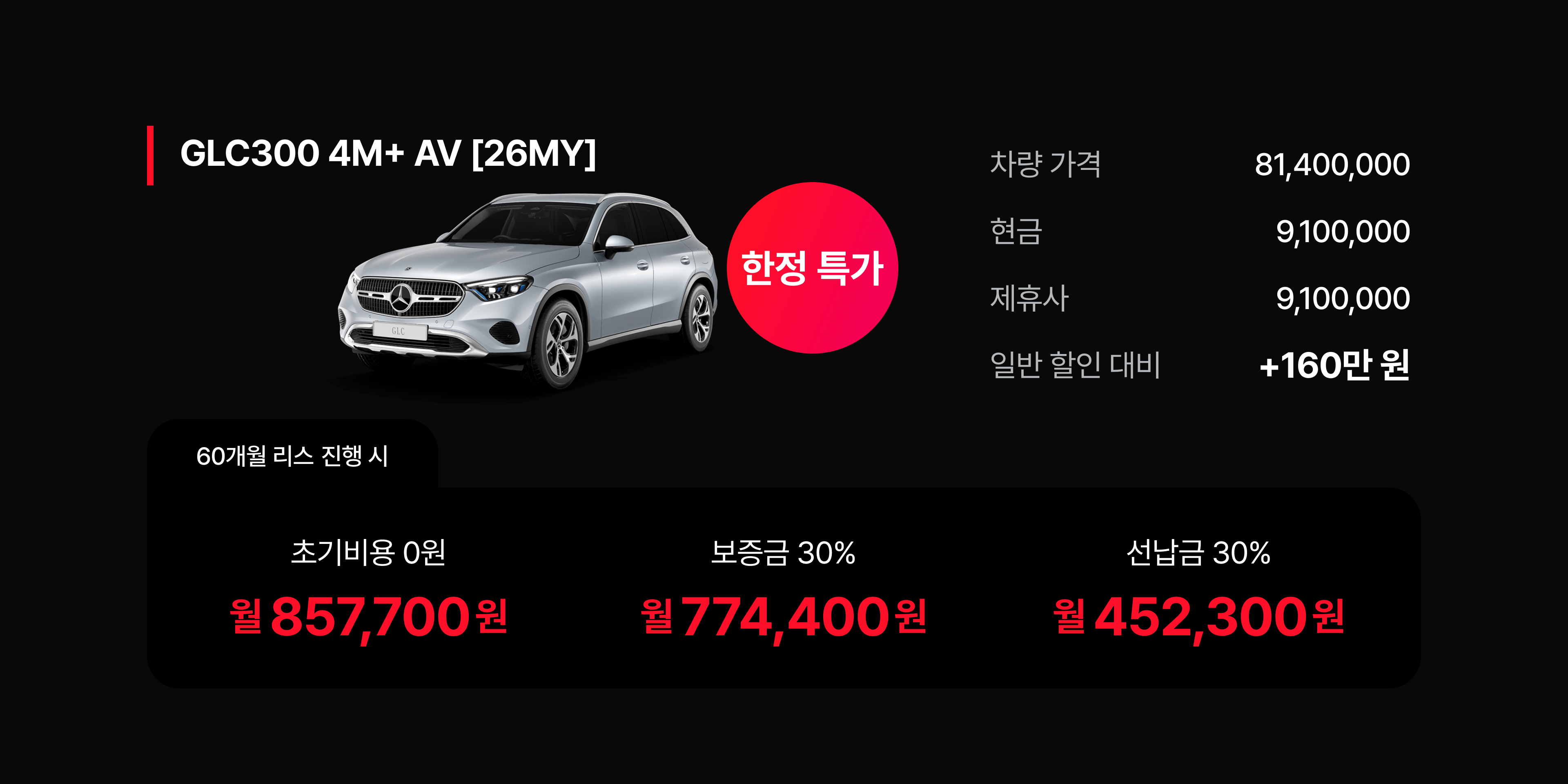 벤츠 GLC 300과 벤츠 GLC 300 쿠페 모델 역시 9,000,000원 이상의 할인을 제공하며 SUV 시장을 공략하고 있다. 두 모델 모두 안정적인 리스 견적을 형성하여 실속파 구매자들에게 매력적인 대안이 된다.