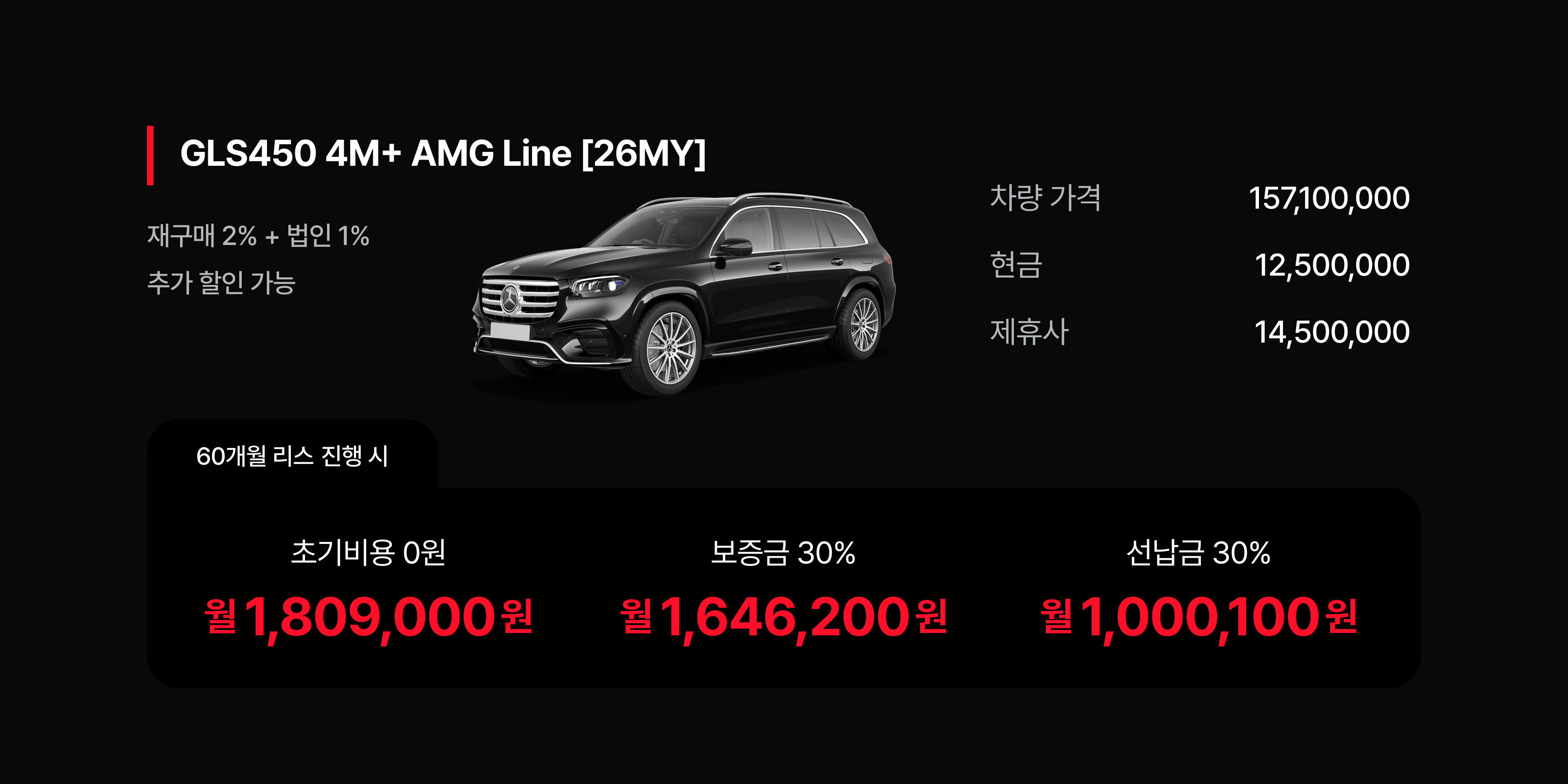 럭셔리 대형 SUV인 벤츠 GLS 450 또한 14,500,000원의 할인을 통해 100만 원대 후반의 리스료를 제안한다. 벤츠 GLS는 공간 활용성과 브랜드 가치를 동시에 추구하는 고소득층의 패밀리카로 여전히 각광받고 있다.