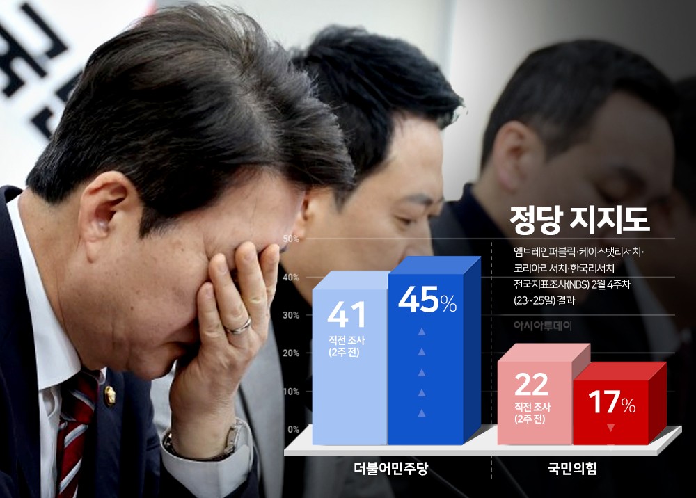 엠브레인퍼블릭·케이스탯리서치·코리아리서치·한국리서치의 전국지표조사(NBS) 2월 4주차(23~25일) 결과에 따르면 민주당 지지율은 45%로 직전 조사(2주 전)보다 4%포인트(p) 올랐다. 국민의힘은 17%로 5%p 하락했다. 이는 이재명 대통령 취임 이후 실시된 NBS 조사에서 국민의힘 지지율로는 지난해 8월 1주 차(16%)에 이어 두 번째로 낮은 수치다.