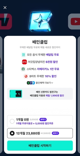 26일 업계에 따르면 배민은 '배민클럽'에 12개월 주기 연간 이용권을 출시했다. 기존 월 3990원이었던 배민클럽 이용료 1년 치를 한꺼번에 결제하는 고객에게 프로모션 혜택을 더해 총 2만3880원으로 제공한다. 이를 월 요금으로 환산하면 기존 월간 구독료 대비 약 49% 저렴한 약 1990원꼴이다. 기존 대비 사실상 '반값'으로 멤버십 혜택을 누릴 수 있는 셈이다.