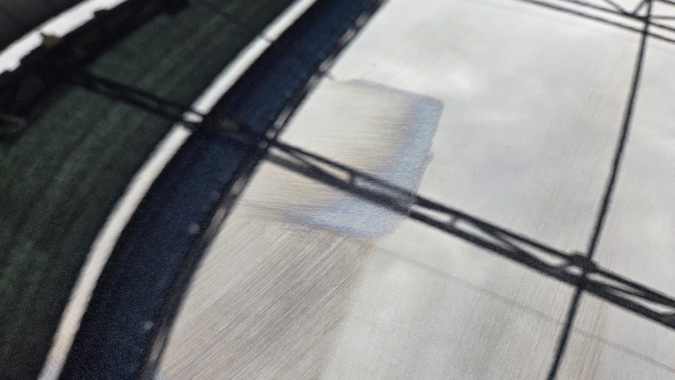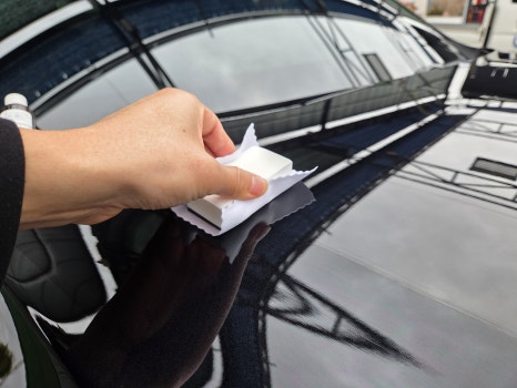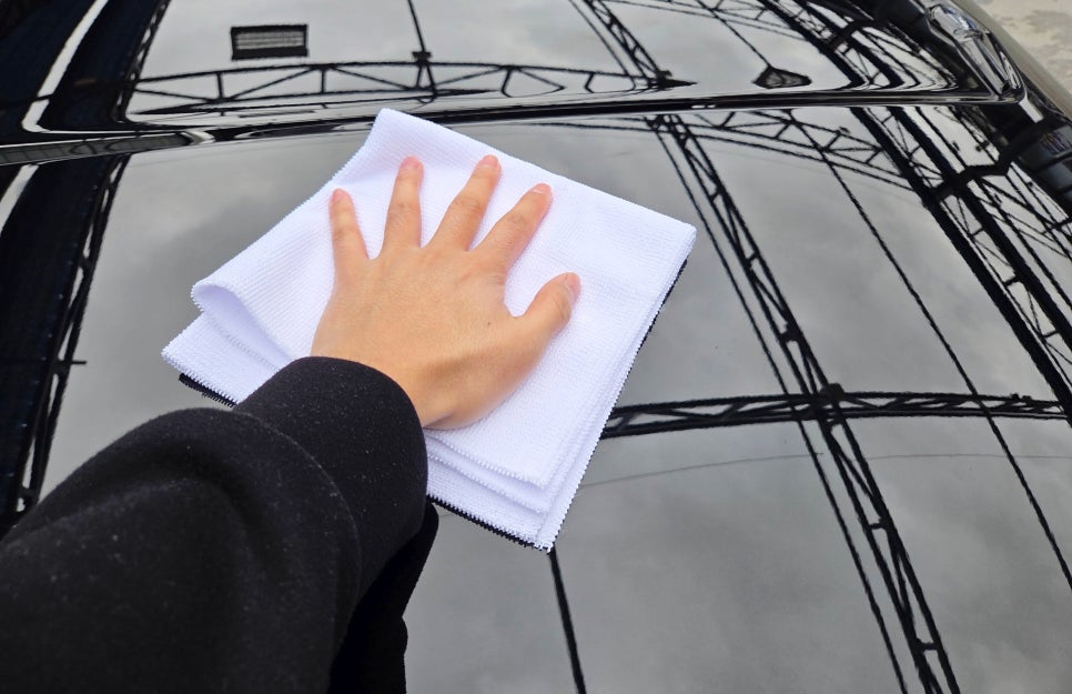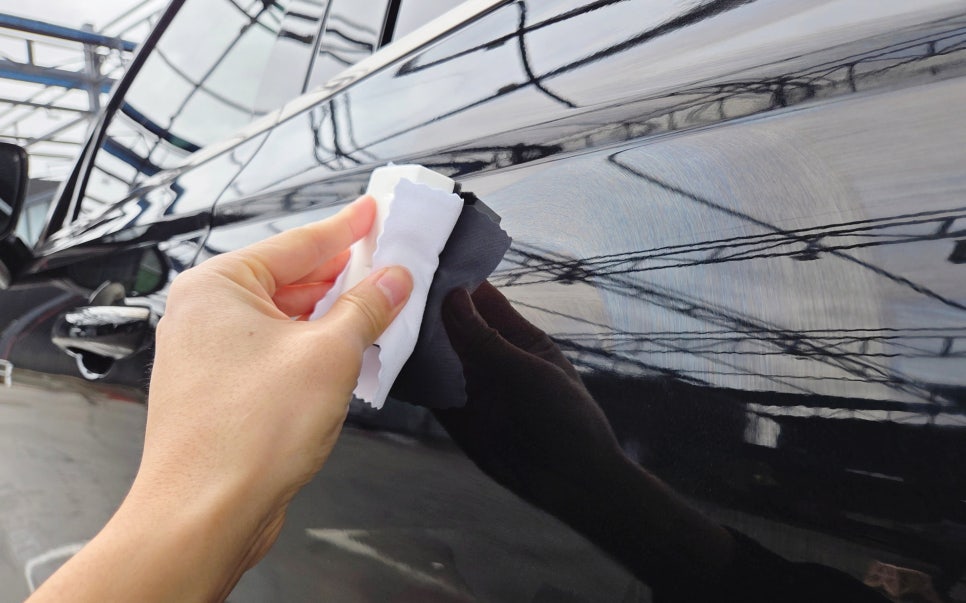 모든 곳에 도포했음에도 약품이 남아 있다면 모두 소진할 때까지 두껍게 발라주시는 게 중요합니다(한 병당 한 대). 경화제를 넣은 시간부터 60분 후 도포했던 유리막 코팅제를 닦아주시면 되는데요. 굳을 수 있기 때문에 1차적으로 빠르게 닦고, 2차, 3차부터는 도장면에 남은 무지갯빛 잔사를 닦아주시면 되겠죠. 어두운 곳에서 잘 안 보일 수 있어, 자연광 있는 곳에서 작업하시는 게 좋습니다.