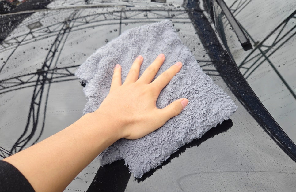 유리막 코팅제를 바르기 전, 물기를 깔끔히 닦아주셔야겠죠. 폼포나치 드라잉타월 6040 사용할 텐데요. 60cm*40cm 적당한 사이즈로 간편하게 사용할 수 있었죠 또한 폴리나일론 원사구조 덕분에 미세한 오염물질들이 제거될 때 데미지를 최소화시켜 줍니다. 일반 드라잉타월과는 다른 감촉을 느낄 수 있었습니다. 특히 드라잉 전에는 꼭 물에 적신 후 짜서 사용해 주셔야 됩니다!