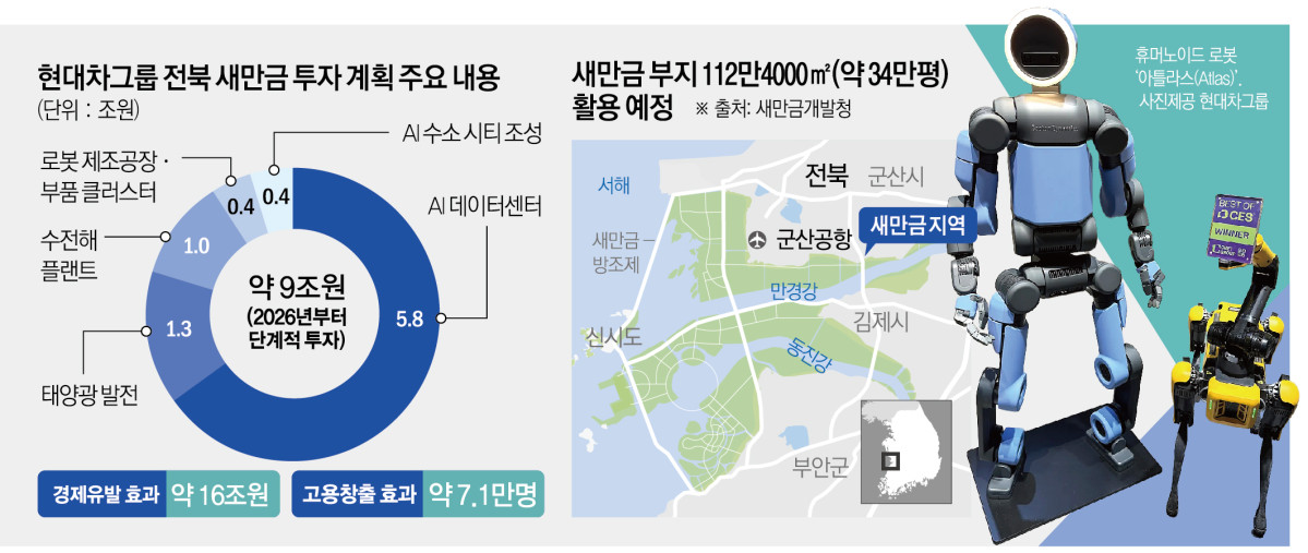 2일 현대차그룹에 따르면 지난달 27일 전북 군산새만금컨벤션센터에서 정부와 전북특별자치도, 새만금개발청 등과 ‘새만금 로봇·수소 첨단산업 육성 및 AI 수소 시티 조성을 위한 투자협약(MOU)’을 체결했다. 그룹은 2026년부터 새만금 112만4000㎡(약 34만 평) 부지에 9조원을 단계적으로 투입한다. 핵심은 △AI 데이터센터 △로봇 제조 및 부품 클러스터 △수전해 기반 청정수소 생산 플랜트 △태양광 발전 설비 △AI 수소 시티 조성이다.