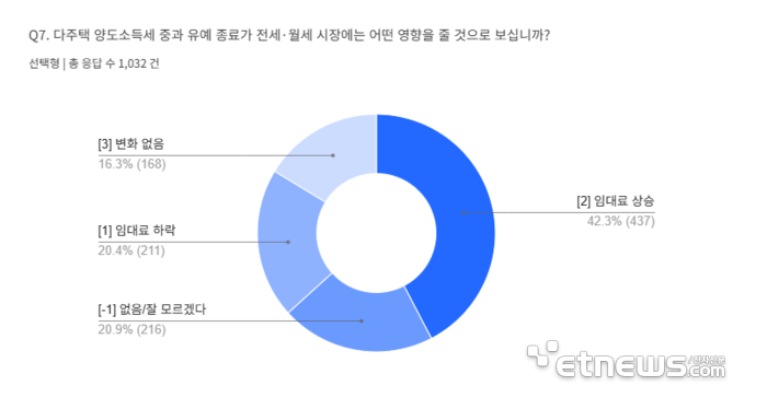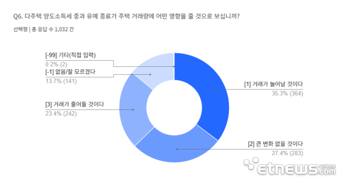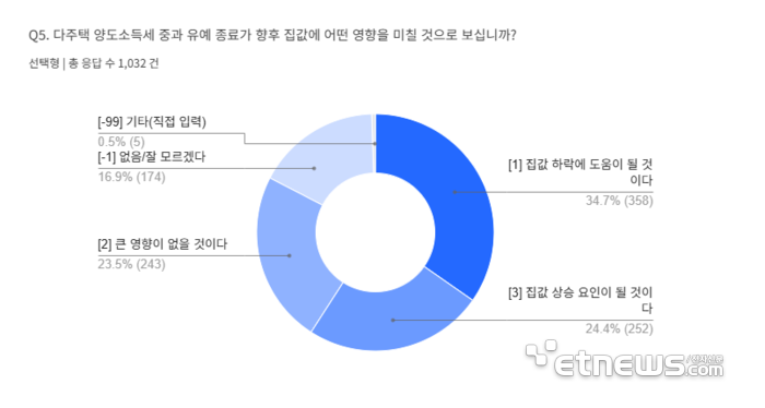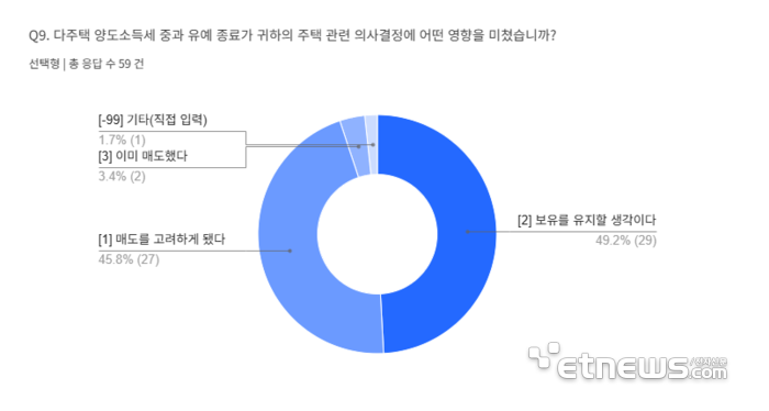 다주택자 대상, 이번 조치가 개인의 주택 관련 의사결정에 영향을 미쳤거나 미칠 것으로 보느냐는 질문에 대해서는 '영향이 있다'는 응답이 50.4%, '없다'는 응답이 49.6%로 팽팽하게 나타났다. 영향을 받았다고 답한 응답자 중에서는 '보유를 유지할 생각'이라는 비율이 49.2%로 가장 높았고 '매도를 고려하게 됐다'는 응답도 45.8%로 나타났다. 이미 매도했다는 응답은 3.4%에 그쳤다.