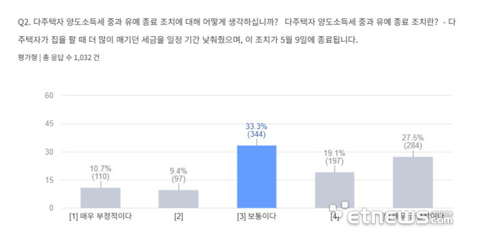 3일 조사 결과에 따르면 국민 절반 가까이가 부동산 양도세 중과 유예 종료에 대해 긍정 평가를 내린 것으로 나타났다. 구체적으로 긍정 응답(4·5점)이 46.6%로 부정 응답(1·2점) 20.1%를 크게 웃돌았다.