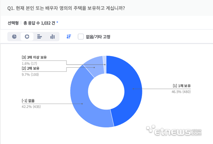 한편 응답자의 주택 보유 현황은 1주택 46.5%, 무주택 42.2%, 2주택 9.7%, 3주택 이상 1.6%로 나타났다. 이번 조사는 2월 20일 하루 동안 1032명을 대상으로 진행됐다. 표본오차는 80% 신뢰수준에서 ±2.00%p다.