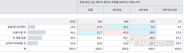구체적으로 무주택자와 1주택자의 경우 경우 도움이 될 것이라는 응답이 각각 31.7%, 42.5%로 가장 높게 나타났다. 2주택자와 3채 이상 보유자는 '큰 영향 없음'이 44%, 47.1%로 1위를 차지했다.
