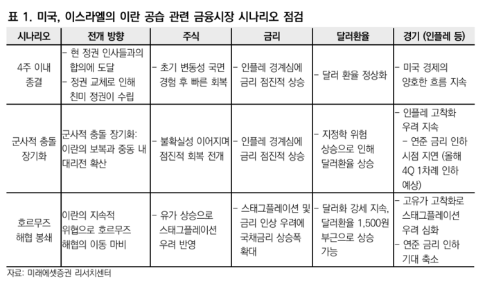 국내 증권가는 금융시장에 미치는 영향이 전쟁의 '지속기간'에 달려 있다고 본다. 미래에셋증권 리서치센터는 △4주 내 종결 시 단기 변동성 이후 회복 △군사 충돌 장기화 시 달러 강세·금리 상승 △호르무즈 해협 봉쇄 시 스태그플레이션 우려 확대라는 시나리오를 제시했다.