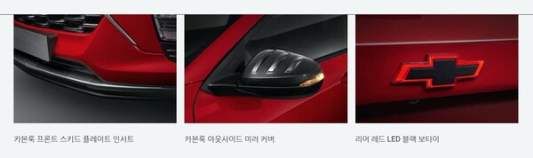 외관에는 카본룩 프론트 스키드 플레이트 인서트와 카본룩 아웃사이드 미러 커버가 적용됐습니다. 여기에 RS 전용 글로스 블랙 그릴과 트리탄 크롬 그릴바가 더해지면서 레드 포인트와 카본 디테일이 대비를 이루는 스포티한 분위기를 강조했습니다. 이러한 디자인 구성은 기존 트랙스의 날렵한 크로스오버 스타일과 맞물리며, 소형 SUV지만 한층 공격적인 이미지를 강조하는 방향으로 완성됐습니다.
