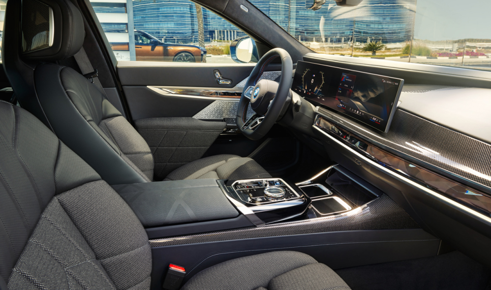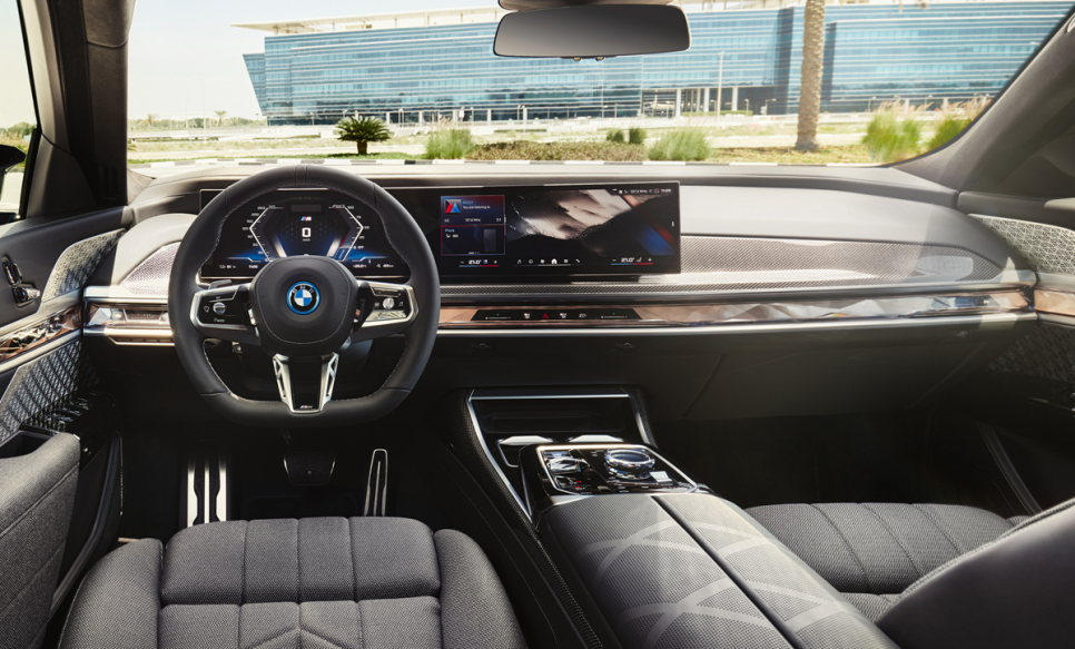 BMW i7 M70의 실내 디자인은 이동하는 럭셔리 라운지라고 불릴 정도로 완성도가 높습니다. 먼저 스포티한 감성의 3-스포크 D 컷 스티어링 휠과 12.3인치 계기판, 최신 BMW OS 기반 14.9인치 센터 디스플레이 일체형 커브드 디스플레이 등 현대적인 구성도 잘 갖추고 있죠. 참고로 런치 컨트롤 버튼은 왜 없냐고 할 수 있는데, 브레이크 밟은 상태에서 엑셀을 끝까지 밟으면 계기판 런치 컨트롤 표시가 나옵니다. 즉 작동 방식이 다르죠.