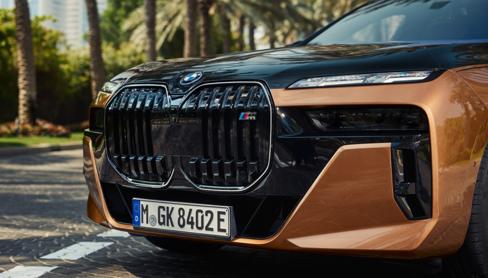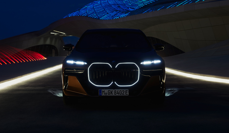 BMW i7 M70의 외관 디자인은 기존 7시리즈보다 훨씬 강렬하고 미래지향적인 디자인을 보여줍니다. 전면부에는 BMW 특유의 대형 키드니 그릴이 적용되며, 특히 아이코닉 글로우(Iconic Glow) 조명 그릴이 더해져 야간에도 압도적인 존재감을 드러냅니다. 슬림한 상단 DRL과 분리형 헤드램프 구조는 최신 BMW 디자인 언어를 반영하며, 고급스러움과 첨단 이미지를 동시에 강조합니다.