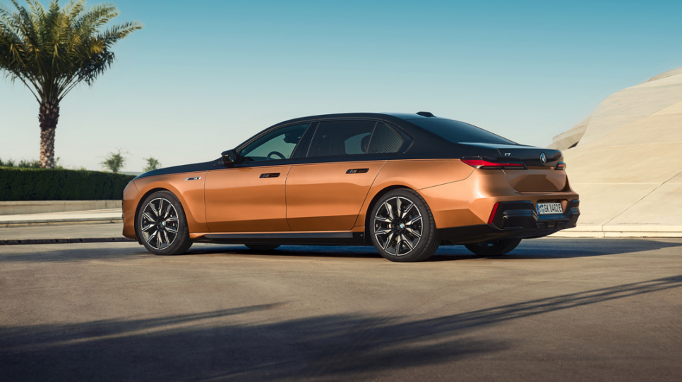 BMW i7 M70 제원은 전장 5,390mm, 전폭 1,950mm, 전고 1,545mm, 휠베이스 3,215mm 엄청난 크기를 갖춘 대형 세단이죠. 측면부는 긴 휠베이스와 매끄러운 루프라인이 조화를 이루며 전형적인 플래그십 세단의 비율을 보여줍니다. 휠은 기본 21인치가 들어가지만 옵션 시 22인치까지 넣으면서 웅장하 모습까지 제공합니다. 또한 투 톤 컬러는 기본 색상이 아니라 고급 유료 옵션으로 약 천만 원 상당의 옵션이고, 투톤 컬러 구성은 약 8가지 제공하고 있죠.
