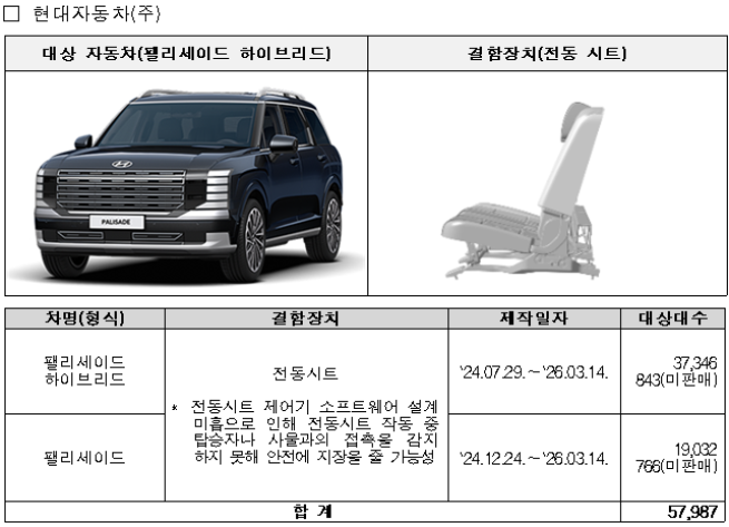 팰리세이드 전동시트 결함 리콜…현대차·기아 등 40만대 시정조치